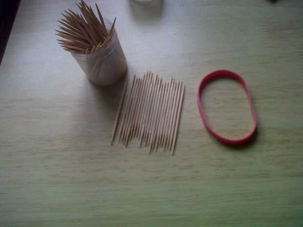 Esta parte es un poco complicado (bueno fue para mí!). Sobre 15-20 palillos de dientes y una pequeña banda elástica (tenía un grande pero si tienes un pequeño son mejores) para hacer los palillos al final. Mejor antes que nada recortar los escarbadientes para que no te van a irritar la mano al escribir. Ahora necesita abrigarse los escarbadientes y asegurarlos para el extremo despuntado de lápiz (el lado sin el plomo hacia) con la banda elástica. no tiene que ser cuidada porque se trata la siguiente parte. como su adjunto al lápiz podemos sacar algunos de los palillos de dientes y empieza a organizar en lugares confortables. Esto es más fácil, pero asegúrese de que tiene la banda elástica con algunos de los escarbadientes envueltos junto con el lápiz/pluma o podría salir mal. ahora debe tener una línea limpia todo el lápiz/pluma de palillos de dientes. no importa si hay algunos repuestos que acaba de hacer una estimación.