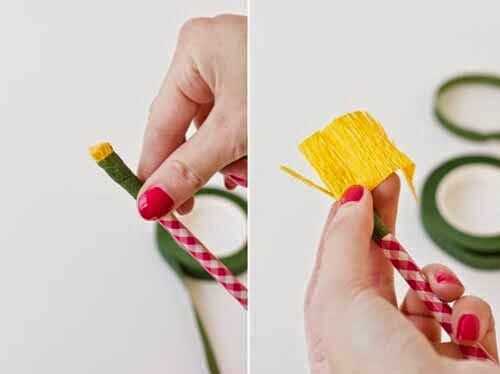 Corte borlas en papel amarillo y enrollarlo alrededor de la goma de borrar para hacer el pistilo. Utilice cinta adhesiva verde para enrollarlo alrededor del pistilo amarillo.