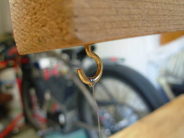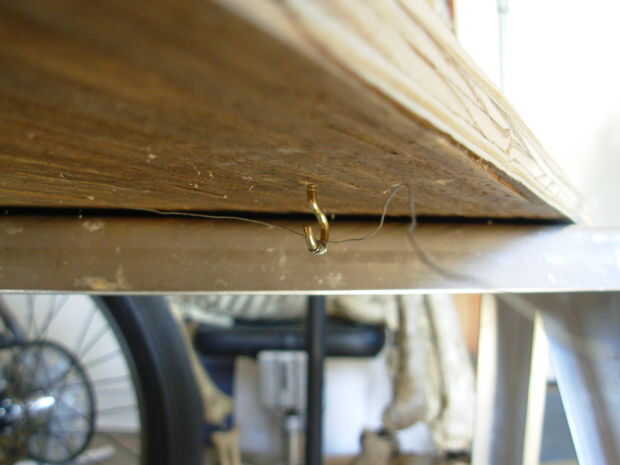 Lo siguiente que haremos es añadir las piezas más pequeñas, tales como los ojales y alambre. Atornille los ojales en la parte superior primero y luego perfore un pequeño agujero justo debajo el ojete utilizando una regla de 90 grados como guía. El ojete de segunda debe ir debajo de la base, para no interferir con el corte. Una vez que este agujero se perfora, tornillo en el segundo ojal al lado del agujero. No importa donde, siempre y cuando no está demasiado lejos (una pérdida de cable). Si se puede, poner un relleno aislante de calor en el agujero porque el hilo tiende a quemar la madera. Alimente el alambre artesanal para arriba a través del orificio en la base y Envuélvala alrededor de la anilla superior. Entonces estire el cable y enróllelo alrededor del orificio de la parte inferior. Una vez que estés feliz con la colocación del alambre, corte el extremo de la bobina.