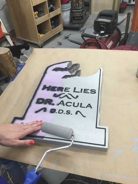 El plan aquí es pintar las letras primero y luego con un rodillo de espuma dura y pintar la parte superior. Sé lo que estás pensando... la pintura de aerosol sería perfecta para este! Desafortunadamente, los productos químicos en la pintura de aerosol derretirán la espuma y obtendrá resultados algo impredecibles. Yo diría que no pueden usar más "intemperie", pero la pintura realmente no se pega bien en fin. En lugar de pintura en aerosol, utiliza un pincel de aire para todas las piezas talladas fuera de color negro y luego volví con un rodillo de espuma rígida y había pintado las tapas de un color "Gris piedra". Tuve que usar un cepillo pequeño para obtener esquinas y algunos de los puntos más finos. Después de que el gris era seco, volví con el aerógrafo usando a una distancia y añade profundidad y más "intemperie".