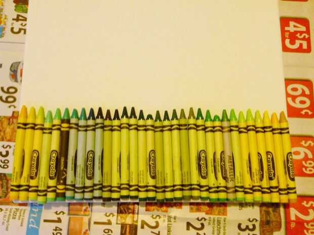 Organizar lápices de colores en la secuencia del color de su elección y que los ponen en la lona. Si decide romper por la mitad o desenvolver las ceras Asegúrese de esto antes de tenerlos dispuestos sobre el lienzo.