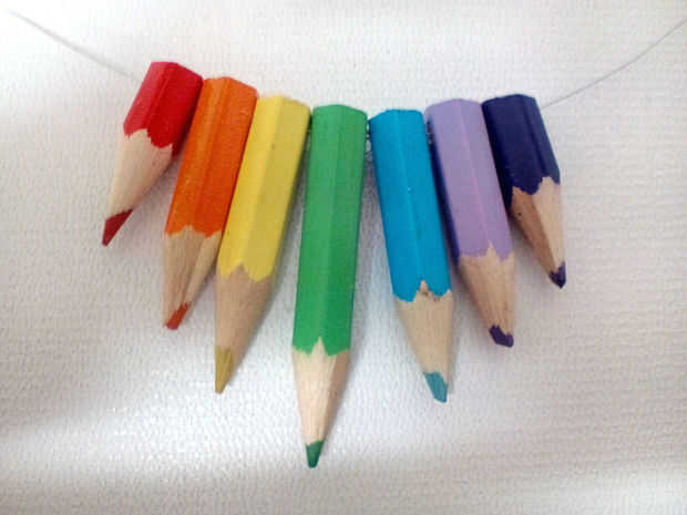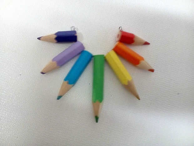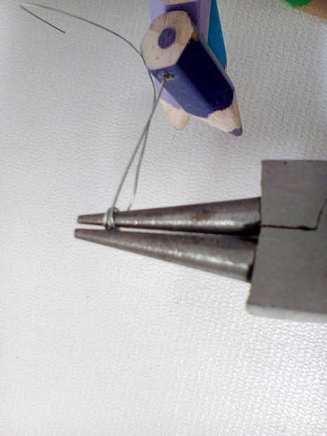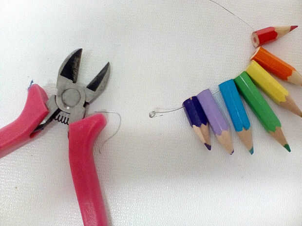 A continuación, enrosque los lápices sobre el alambre de calibre fino hobby. Forma el cable entonces, usando alicates de punta, crear lazos de alambre en cada extremo. Corte el exceso, luego introducir el extremo del alambre en el orificio de lápiz para ocultarlo. Repita ambos extremos.