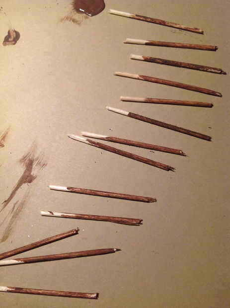 Colocar el lápiz enarenado y palillos de dientes en su espacio de trabajo (podría conseguir pintura en él, así que establecen a diario puede ser una buena idea). Pintar sin embargo fina o gruesa que le gustaría. Usé un color marrón oscuro, dándole un toque de palo de escoba tradicional, pero si quieres una Nimbus 2000 (o 2001, que molestos Slytherin), usted puede pintar más claro o más oscuro.