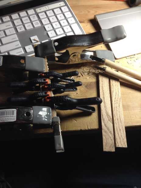 Un buen tamaño de gota de pegamento para madera en cada daddo y cuidadosamente Aplique pegamento a cada lado de la cabeza, entonces montar el lápiz. Sujete el lápiz a lo largo de su longitud. Las abrazaderas de muelle mediano a grande son buenas para esto, pero utilizan todo lo que tienes. Si pones suficiente pegamento en usted a conseguir mucho exprimir hacia fuera en los lados. Esto está bien, se la arena esta después de su secado.