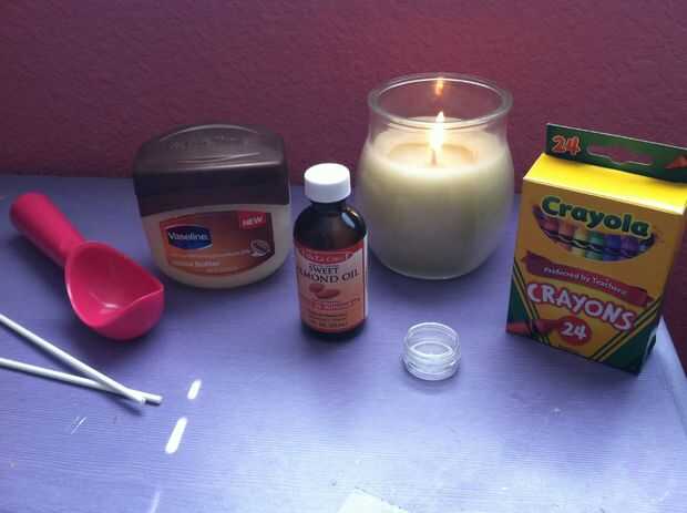 1. lápices de colores de su elección 2. 1/2 cucharadita de cualquier tipo de aceite (oliva, almendra, jojoba, etc.) 3. vaselina o manteca de karité 4. Palillo para revolver con 5. Recipiente pequeño 6. Fuente de calor (como una vela o una estufa) 7. Cuchara de metal para ingredientes de calor en