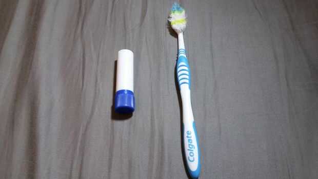 Haz toda la basura dentro de la barra de labios usando la mano y el cepillo de dientes viejo, tome su cepillo de dientes viejo y alguna sopa y cepillo dentro de ella con una sopa.