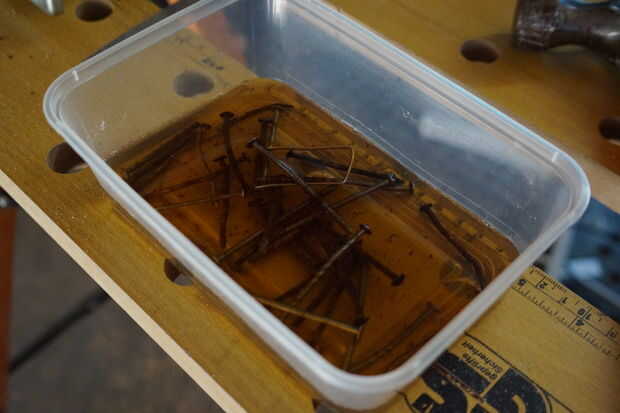 Para hacer la solución, sólo mezclar clavos oxidados y vinagre en un recipiente y dejar disolver durante unas horas.