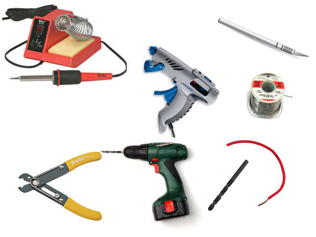 Usted necesita las herramientas estándar; soldadura estación y soldadura, taladro y brocas 1/16" y 11/32", pelacables, x-acto cuchillo o navaja, caliente de la pistola de pegamento, alambre, imán del neodimio, arandela pequeña.