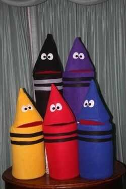 títeres de creyón son grandes para los colores por escolares de enseñanza! También son excelentes usar como una adición a su espectáculo de marionetas! En unos sencillos pasos tendrás tu propio! Materiales que necesitará: un paño grueso y suave del color de su elección, rojo paño grueso y suave (si es un creyón rojo usar negro en vez de rojo), fieltro negro, 1/2" de espuma de poli-urathane, cemento de contacto, ojos de artesanía (mina obtener fuera de la caja puppets.com), tijeras, cuchillas de afeitar, marcador, tablero de la espuma y la cinta del conducto