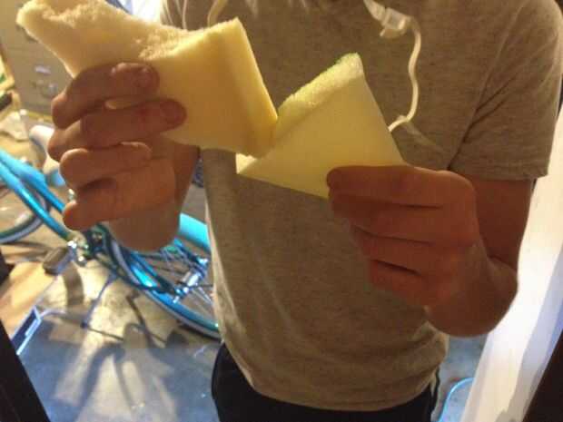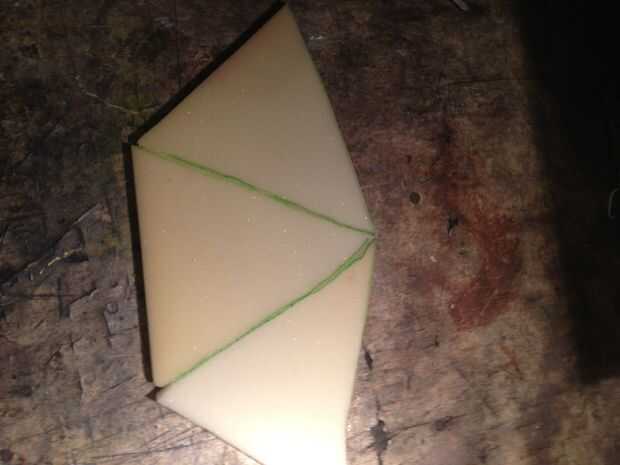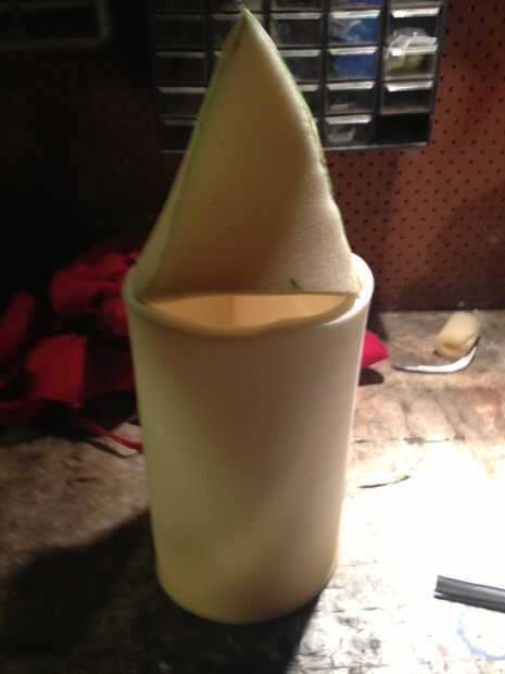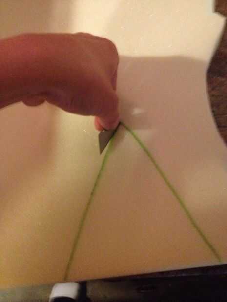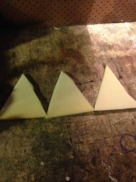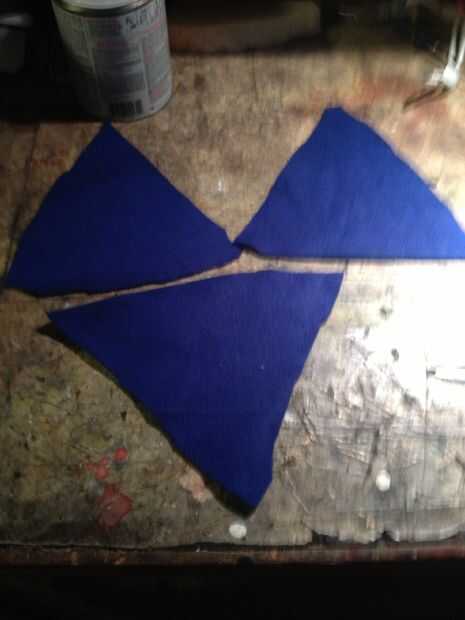 Para hacer la cabeza: 1) cortar tres triángulos del mismo tamaño, se trata de su cráneo. 2) a lo largo de los lados largos de los triángulos dab pegamento, no uso mucho! Deje que se seque hasta hortera hasta juntar (5 min.) 3) ahora trazar el mismo patrón de triángulo utilizado para el cráneo en un pedazo de paño grueso y suave. Añadir el margen de costura de 1" a todos los lados. 4) a la máquina de coser y veamos juntos los bordes de los lados. Ahora coloque a la tela sobre la espuma.