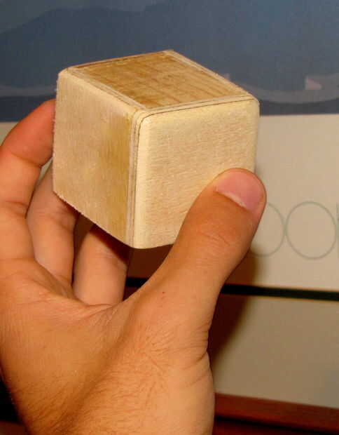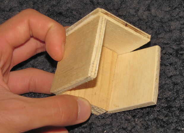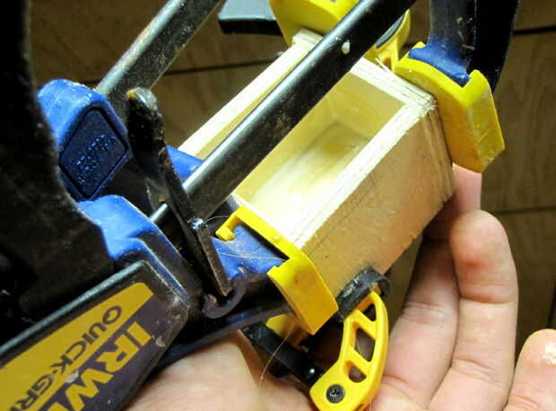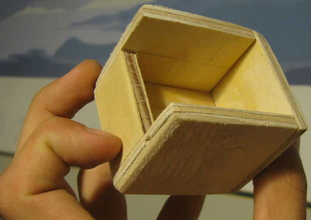 Al igual que cualquier otra cosa, el robot de Instructables tiene una cabeza robusta. En este paso nos va ser Juntándolo! Necesita reunir más madera de pulgadas de trimestre primero. Cortar la madera para que tenga tres cuadrados de 2 pulgadas de la cara y dos caras, una de 1.5" por 1.75" rectángulo de la parte superior y uno más 1.5" por 1" rectángulo para la parte de atrás. Ajuste estas juntos y asegúrese de que pueden formar una cabina agradable como muestra la imagen. Debe dejar un extremo abierto del cubo, por lo que puede caber en la parte superior de su compañero de escritorio. Ahora que tienes todas las piezas juntas, es hora de cola para arriba! Hacer este paso tanto como la última de ellas con pegamento de madera. Asegúrese de que una vez tienes el pegamento y las piezas muy bien situadas para abrazadera todos juntos y dejar que se sequen por un tiempo. Después se seca la pieza, las piezas deben estar listas para pulir. Biselados los bordes de la cabeza para que se vea un poco mejor. Ahora estás listo para empezar a hacer la bisagra entre el torso y la cabeza!