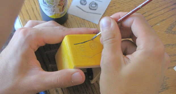 Mi parte favorita de este proyecto fue pintar la cabeza de la robusteza de Instructables famoso del mundo! Para ello el primer paso es pintar el exterior de la cabeza todo amarillo como el último paso. También pinté el interior de la cabeza negra y el borde de lo azul, sólo para hacer que las cosas se vean bien. Una vez que estas piezas son todos pintaron a su hora de sacar el pincel y hacen algunos trabajo detallado fino! Primero dibuja tu diseño en un pedazo de papel y luego copiarlo a la cabeza ligeramente con un lápiz. Usando pinturas y pintura fina cepillo comienzo a llenar la cara. Alternativamente se puede utilizar un marcador permanente para este paso. Una vez que termines con el facial detalles de su tiempo para hacer las orejas o cosas de antena. Para éstos usé una tira de madera (de media pulgada de ancho) y unos pequeños clavos. Usé una sierra pequeña para cortar el grano de madera por la mitad, luego pintados de ambas mitades del grano rojo para que coincida con el robot de instructables. Tomando las dos uñas había presentada fuera de los puntos y luego había pintado negro. Una vez que tuve todas las piezas que he encontrado los centros de los dos lados de la cabeza y entonces usando pegamento caliente, pegué las piezas en. El resultado final debe recordar de una cara de robot muy familiar!