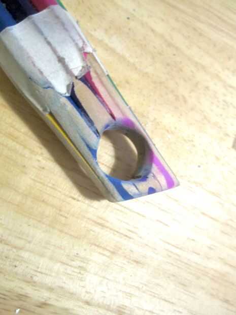 Este paso es obtener la parte superior busca la forma que desee. Lijado hasta que tenía rayas de color en cada lado y luego corta la parte superior en un ángulo.