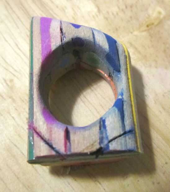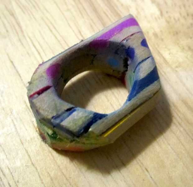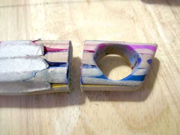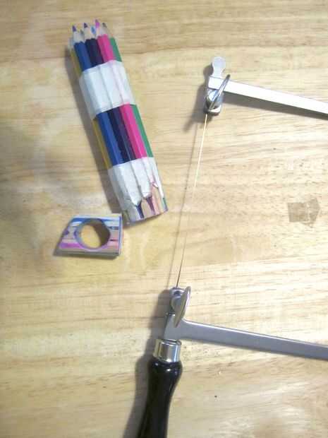 Este es un paso complicado. Tienes que prestar atención a todos los ángulos cuando se cortan las diagonales. Sugiero iniciar el corte mirando hacia abajo en la parte superior del anillo. Luego gire el anillo a cada lado y comienza una diagonal que es paralela al agujero del corte. Cortar un poco y gire, corte y girar, cortar y girar, hasta que se ha cortado a través de.