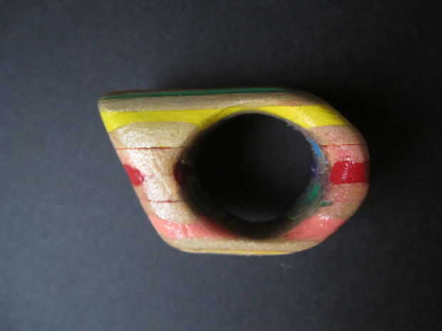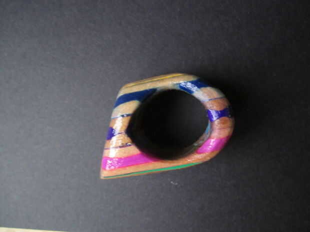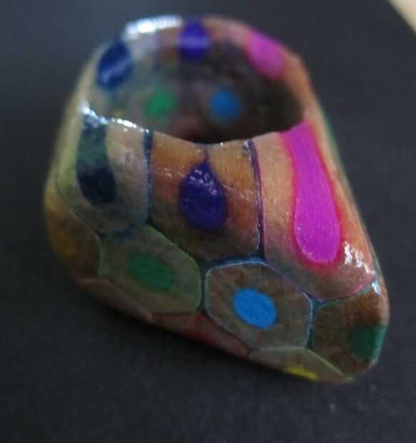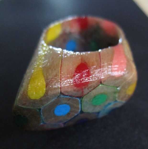 Paso un anillo de una caja de lápices de colores. 12 lápices pegados en un espacio en blanco luego se convirtió en el torno.El resultado es sorprendente! Acabado con laca spray.Tamaño de anillo al poco tamaño de diámetro interno: http://www.walkersje