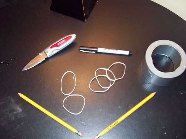 De esta arma... ... Hablo de proyecto, se necesita: 5 gomas, 2 lápices de madera nuevos, un cuchillo (preferiblemente con una hoja serrada no mitad mitad serrada), un rotulador y un rollo de cinta adhesiva.