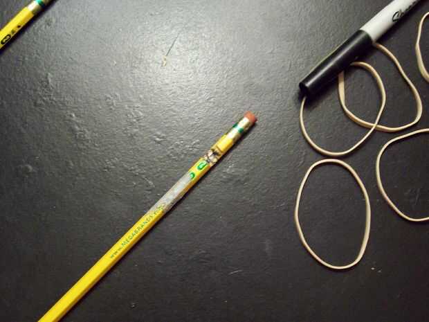 Cerca de 1 1/4 pulgada abajo el lápiz desde el extremo de la goma de borrar, hacer una muesca sobre un amplio ancho de lápiz en dos lápices.