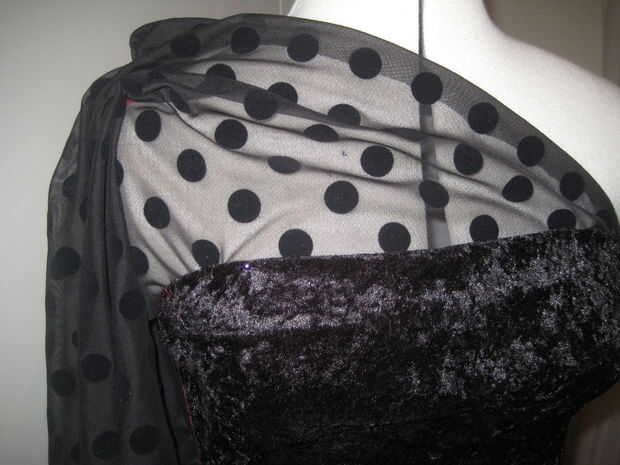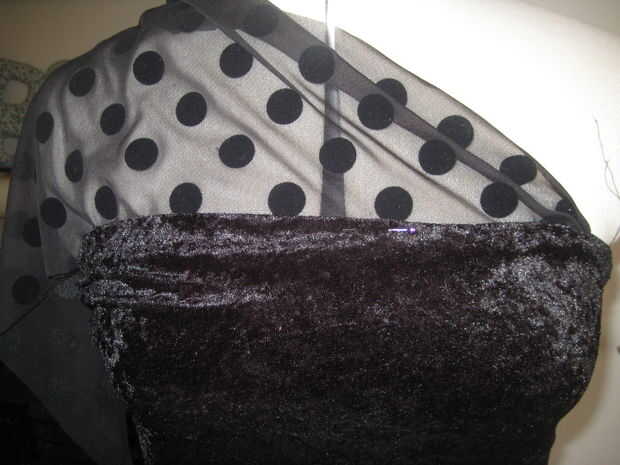Con el vestido a usted, pin 1 pedazo del gasa elástico donde usted lo desee en el frente y la misma en la parte posterior. Tachuela para sostener. A continuación, la máquina en su lugar. Vuelva a colocar el vestido y sólo se reúnen el resto hasta obtener su forma deseada de la manga. Coser a mano.