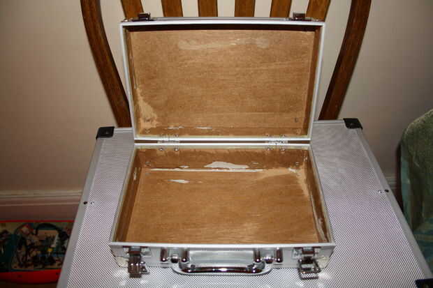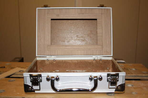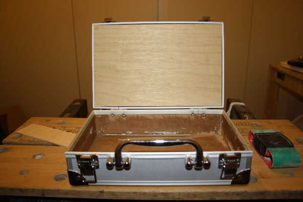 2 | Usando las medidas corta un rectángulo de madera contrachapada y forma para caber dentro de la mitad superior de la caja. He utilizado madera contrachapada de 3 capas de 3mm como esto es lo que tenía a mano en el momento, se puede utilizar casi cualquier espesor que te gusta. Tenga en cuenta que hay algunos remaches de aluminio que sujetan el caso. Puede que necesite hacer ranuras en madera contrachapada gruesa para hacer espacio para ellos.