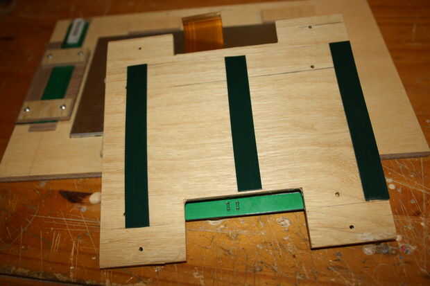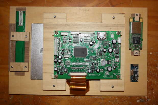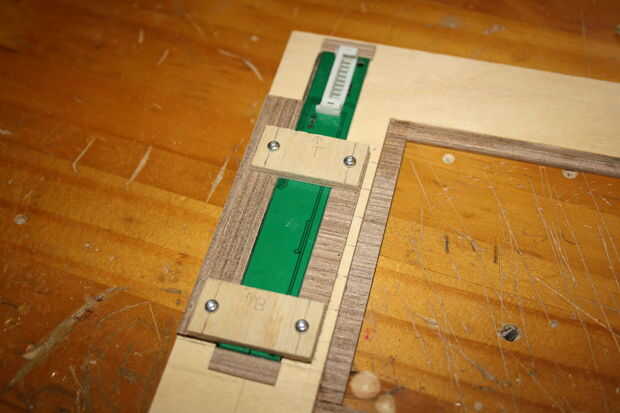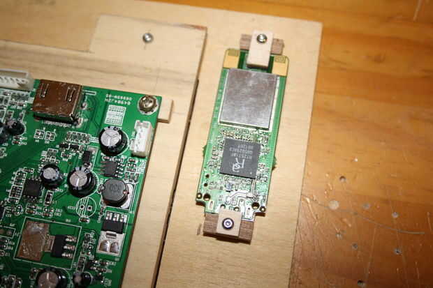 8 | La tarjeta WiFi se asegura mediante dos soportes de madera. Dos tiras de chapa recta el PCB, y dos clips para atornillar manténgalo apretado. Usted tendrá que comprobar la parte inferior de la tarjeta de WiFi para los componentes, no debe falta o descansar contra la madera.