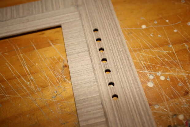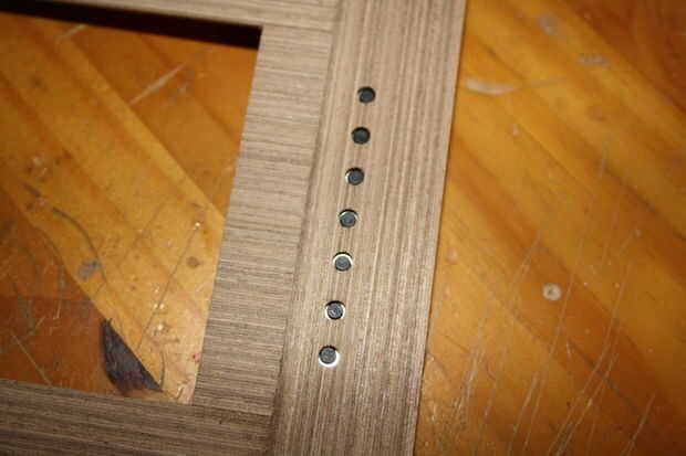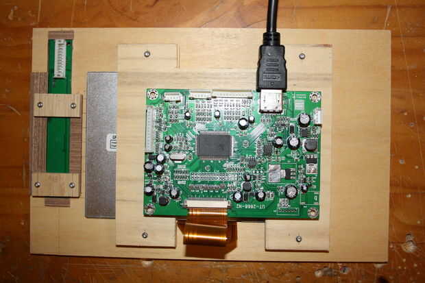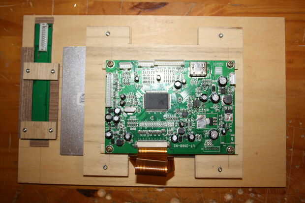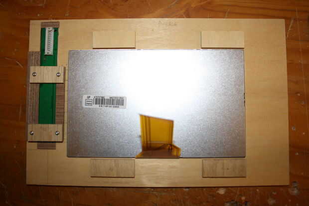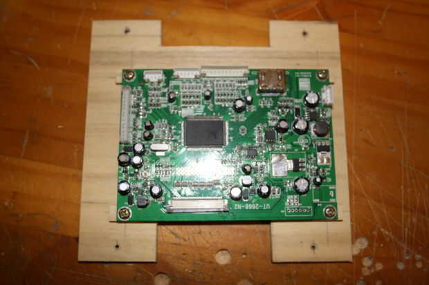 6 | He pegado cuatro soportes de madera más pequeños adicionales sobre las marcas donde van los agujeros del tablero de lógica. Esto levantará la placa de circuito por lo que no falta la parte inferior en la placa trasera. Asegúrese de que usted retire la placa trasera de la LCD cuando taladre agujeros de la placa lógica.