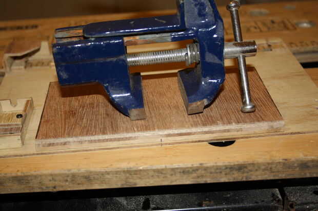 4 | Perforar las cuatro esquinas con brocas para madera, coloque una muestra de madera de desperdicio debajo para evitar el astillamiento de la cara inferior.