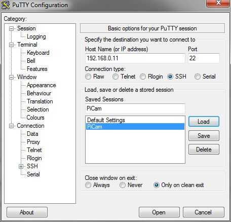 Bueno este es donde va la masilla para ser útil, ya debe tener instalado como te dije al anterior. Con masilla abierto querrá introducir la dirección ip de su frambuesa pi que llegamos en el último paso. Deje el puerto 22, ya es el puerto por defecto utilizado por SSH. (esto puede cambiar para mayor seguridad, pero que no necesitamos para nuestro propósito ahora). Quisiera seguir adelante y añadir un nombre para la conexión en el cuadro 'salvo sesiones' y golpear excepto. De esta manera puede cargar la configuración de conexión rápidamente en cualquier momento que desee conectar con el pi.