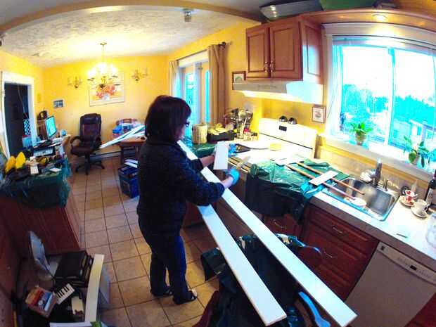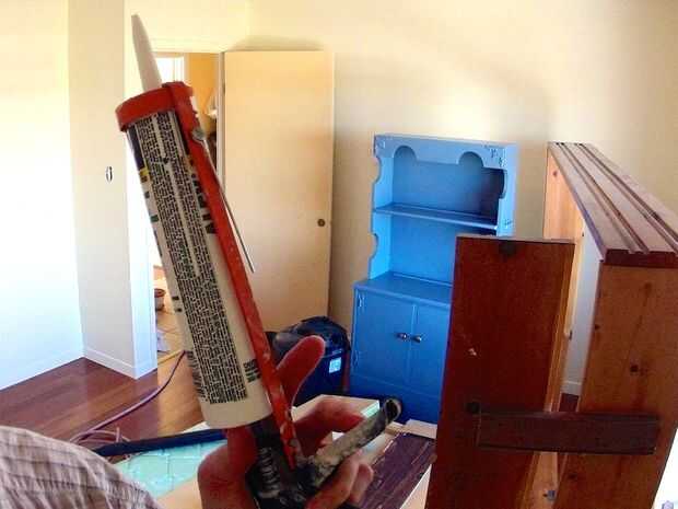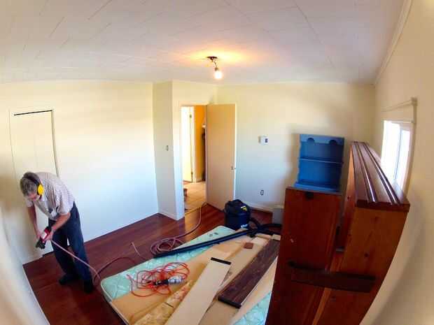 Corté el derecho de piezas del zócalo en el dormitorio con un plástico caja de ingletes y un serrucho. Esto me salvó de varios viajes ida y vuelta al garaje a utilizar la sierra accionado. Después de cortar los ángulos y la prueba de ajuste, hemos pintado las piezas de la placa base (en la cocina) antes de la instalación. Con este enfoque no tienen que preocuparse de conseguir pintura en nuestro nuevo piso. Después de clavar las piezas de la placa base en lugar llené los alargados huecos entre el rodapié y la pared con masilla pintable. Una vez clavado en el lugar (utilicé una pistola de clavos) cubrimos las cabezas de los clavos y calafatear con un cepillo de pintura de rápida.