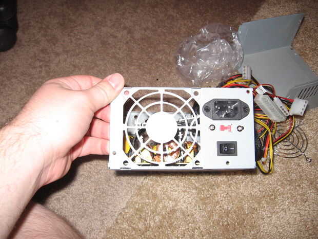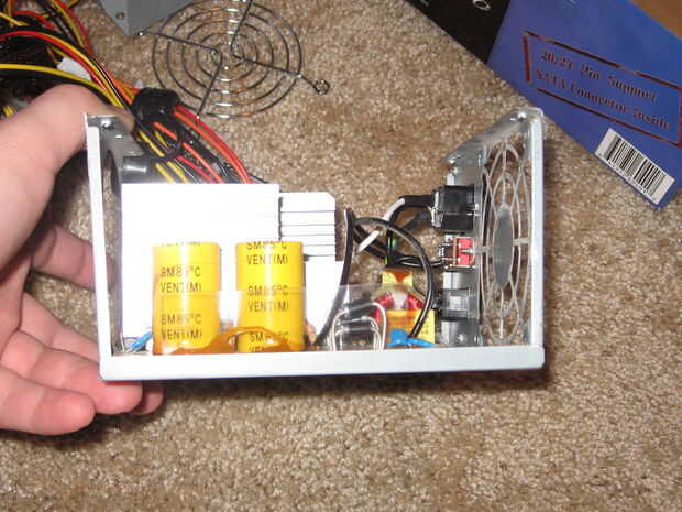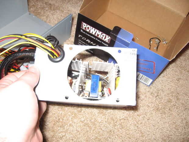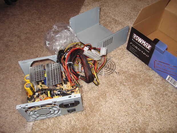 Fuentes de alimentación de ordenador (PSU) tienen condensadores que pueden llevar un golpe potente, suficiente para matarte. Mantiene esta carga durante un período bastante largo de tiempo. Desarmar una fuente de alimentación, si seguro como no tocar la parte inferior de la placa de circuito o cualquier de los condensadores o cualquier de los contactos metálicos en las partes... en general, solo no toques las cosas de metal en el circuito. Toque los disipadores de calor, pero ésos se basan normalmente así que no hay gran cosa. Guantes de plástico si lo desea. Esta fuente fue un modelo de $13 de Newegg para alimentar un PC reconstruido barato. Duró 3 meses antes de accidentalmente en la PC y los disipadores de calor débil tocaron en corto y frito el adaptador de red (no la computadora, afortunadamente) y sacó de mi habitación en el proceso (GFI estúpido). Newegg RMA lo tenía y me enviaron uno nuevo, pero debido a la bajeza de la PSU, no pedir un viejo a devolverse. En vez de simplemente tirar hacia fuera, pensé que sería rescatar cosas de él. Lo primero que debe tomar son los fans.