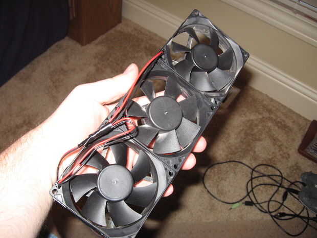 Simple, ponen todos planos 3 ventiladores (Asegúrese de que todos están enfrentando la misma dirección, el lado con las lengüetas de plástico y tapa del motor (generalmente una etiqueta) es el lado del aire viene de). Asegúrese de que los cables están saliendo de la parte inferior de todos los fans de 3. Coger cinta aislante (o su tipo favorito de la cinta, lo que quieras) y la cinta alrededor de los 3 ventiladores hasta formar un ladrillo sólido fanatica.