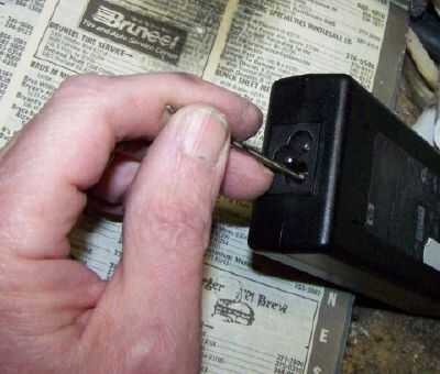 Paso 1: Corte de la vaina viejoDesconecte el cargador!Corte a la antigua envoltura de goma.  Debajo está el tapón de metal, y debe tener 2 cables soldados a él.  Uno es el centro del cable del cargador, y el otro es un corto que se conecta a los fila