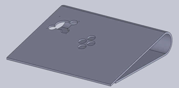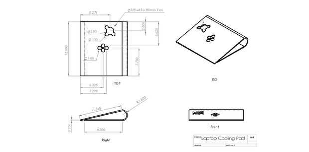El cojín de enfriamiento que se muestra aquí se hace especialmente para caber mi laptop es una HP de 2000. Todos los lugares para los orificios alinean con los orificios de debajo de mi laptop. Las dimensiones también deben caber mi portátil, acepta por el 3" diámetro de la curva que define el ángulo. Usted puede hacer la misma curva de diámetro en el tuyo, es un ángulo cómodo.
