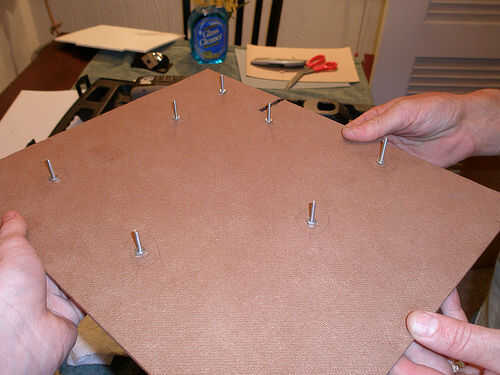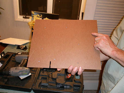 Para mi proyecto, he utilizado un tablero de 1/8" espesor Masonite para montar la placa base y restantes hardware como disco duro, RAM y tarjeta inalámbrica. Inicialmente, tenía tornillos de #6 para venir por el lado opuesto del tablero para utilizar como soporte-offs/monturas, pero eran demasiado grandes y reducido a #4. Después de un ajuste de prueba, corte los tornillos para que no sobresalgan demasiado.