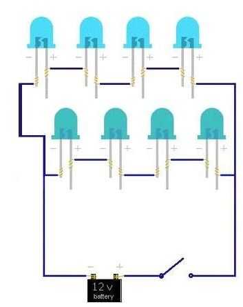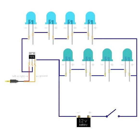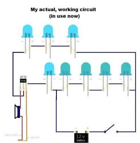 El circuito más grande se compone de dos partes, uno permite actual a través de los 3 diodos superiores cuando recibe la señal de la tarjeta de sonido (Pulsa el resto en serie con el altavoz a bordo), y el segundo de ellos está compuesto por los cuatro diodos inferiores directamente conectados a los 12v.