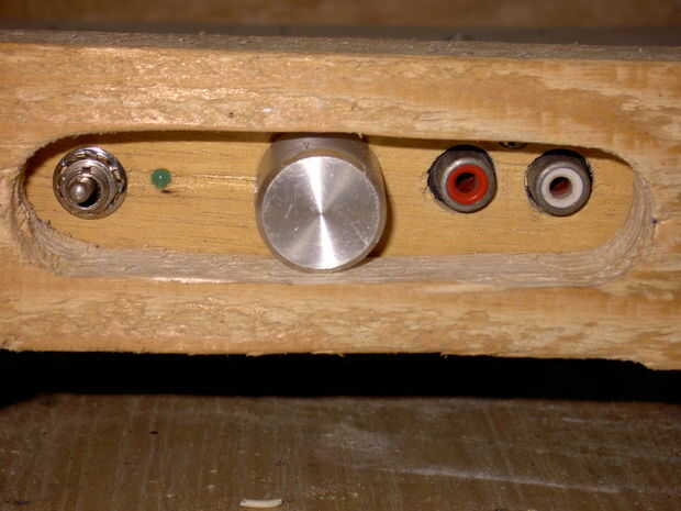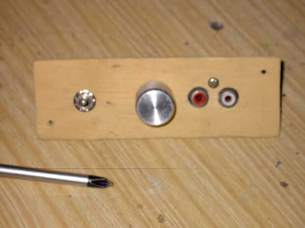 1- primero tornillo en su lugar las entradas RCA y luego el interruptor y el pote, usted notará que he añadido un led en los 2- panel frontal que acabo de hacer un agujero con un destornillador pequeño empuje entonces el led en lugar de verde