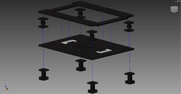 La idea general de mi stand consta de cuatro patas que sostienen una placa de montaje de los ventiladores a. Además de esto son cuatro espaciadores que elevan el portátil cerca de 1/2" por encima de los ventiladores para permitir la circulación de aire. Los pies en la parte inferior del soporte se hacen por pegar un bloque de apoyo en la parte superior un pedazo de acrílico.