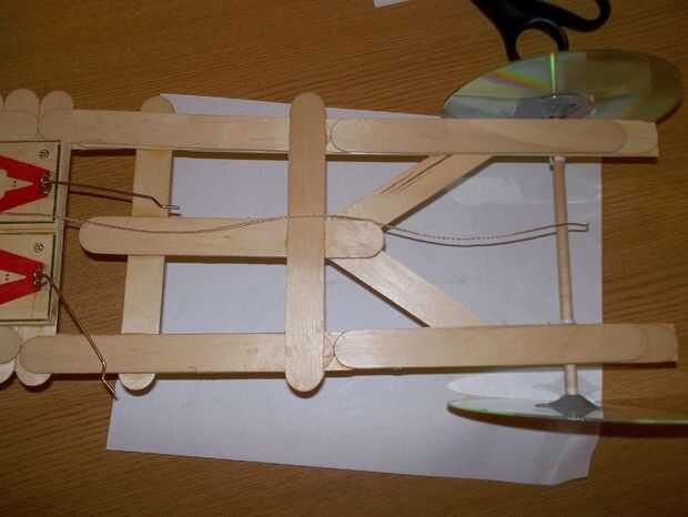 Cruz de añadir secciones cuando sea necesario para mantener el cuerpo juntos. Agregué dos con V como en el final. La razón de esto es porque sería cerca de donde sería el eje y no quería que mi cadena para frotar contra nada. También puse uno de mis soportes en la parte superior e inferior mientras que puse la otra en la parte inferior. Luego pegan tres palos y utiliza para conectar mis ayudas. I utiliza tijeras para cortar el extremo de dos palitos en forma de V y los de la parte inferior del soporte grueso tres palo y en la parte inferior de los palos de dos cuerpo pegados.
