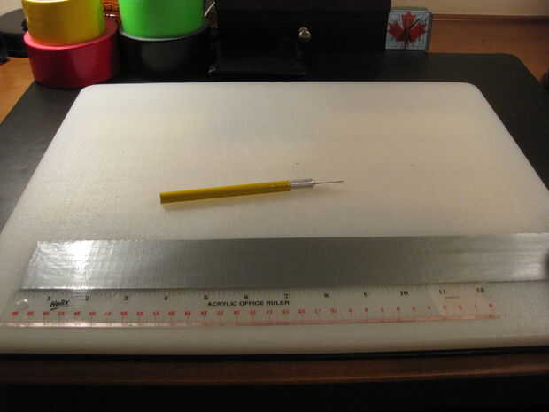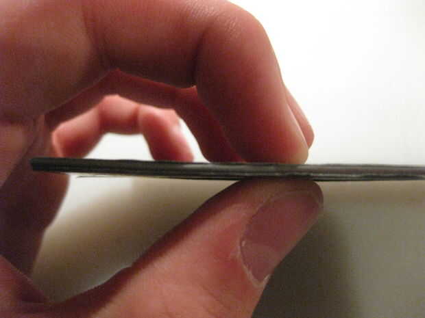 Inicio con su cuchillo x-acto, regla y cualquier color de la cinta del conducto (no importa qué color porque terminarás no verlo). Colocar una tira de cinta y corte a 8 1/2 pulgadas. Luego tome su billetera muestra y coloque otra tira a la altura de lo que es. Lo que tienes tan lejos sobre sea el lado pegajoso del tirón. Cubren el lado pegajoso con tiras de 8 1/2 pulgada. Luego continuar a colocar tiras de 8 1/2 alrededor de él--no cortando cualquier exceso, envolviendo el exceso en la parte siguiente. Continuar haciendo esto hasta que quede un grosor bastante bueno. Cuanto más gruesa la base, va a durar más la cartera. Al llegar a la longitud deseada, coloque dos tiras de aproximadamente 11 pulgadas en su base y dejan el exceso sobre los lados y parte inferior, ya que necesitaremos en el siguiente paso.