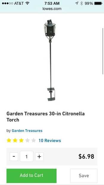 Para esto he encontrado el producto perfecto en Lowes. Es en el extremo inferior de la escala de precios para antorchas de tiki de metal con una calificación muy buena en la durabilidad y el diseño de la antorcha misma. La una queja común es que el tanque se oxida completamente a través dentro de un par de años sin posibilidad de poder comprar un tanque de repuesto.