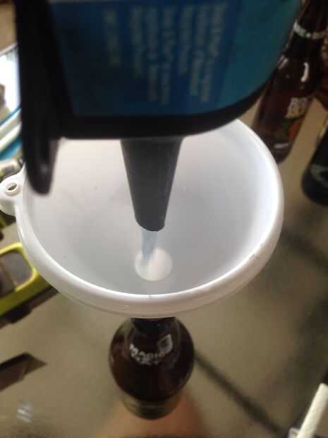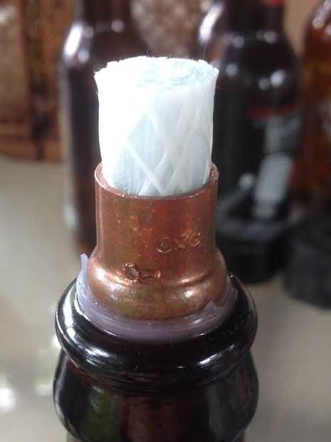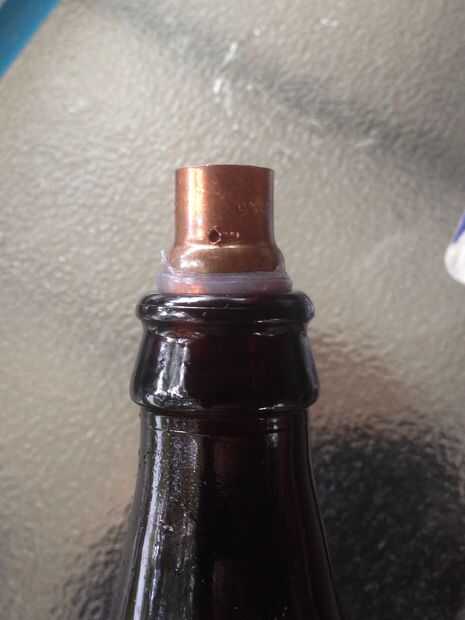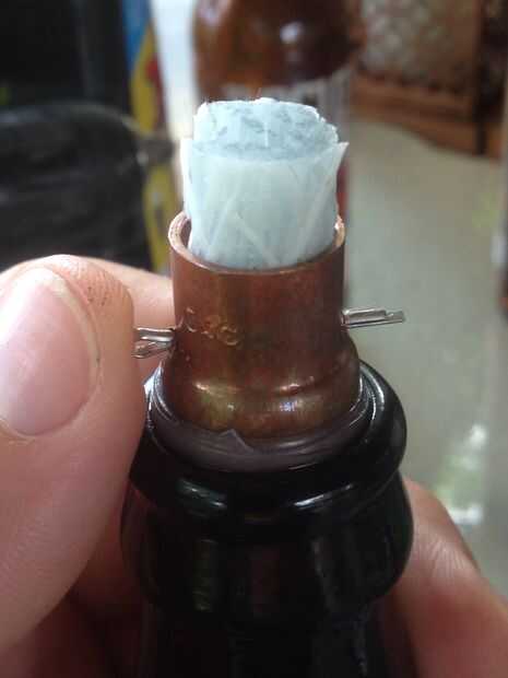 La mecha sólo será tiempo suficiente para ir a medio camino abajo de la botella. Deje aproximadamente 1/4 de pulgada de la mecha expuestos desde la parte superior del acoplamiento. Se taladraron previamente a través de la mecha para que el pasador pasa más fácil.