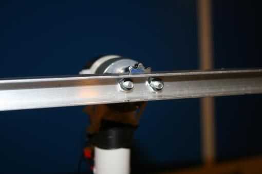 3. aquí tenemos el piñón montado en el brazo principal de aluminio y el motor para una prueba de ajuste para espacios libres.