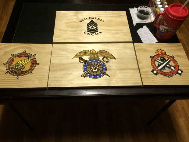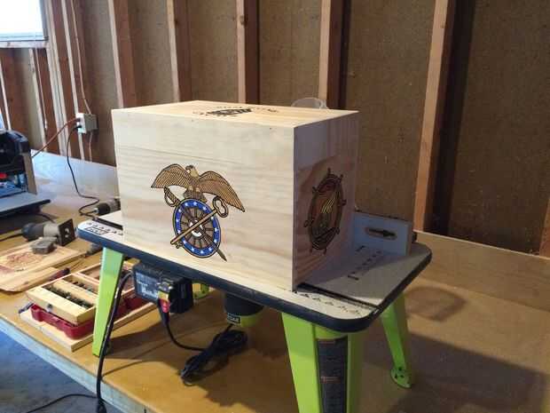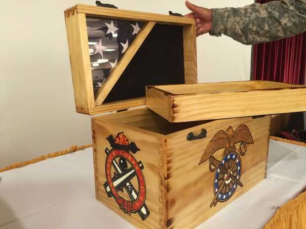 Hice este cuadro para un soldado del ejército de Estados Unidos como regalo ir lejos. En la tapa, la zona negra es un tablero de corcho cubierto con fieltro negro, por lo que el soldado puede poner sus premios/cintas. Me tomó alrededor de 2-3 semanas hacerlo (en espera de pintura seca y poliuretano para la curación y entonces la Asamblea).