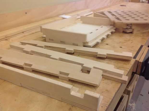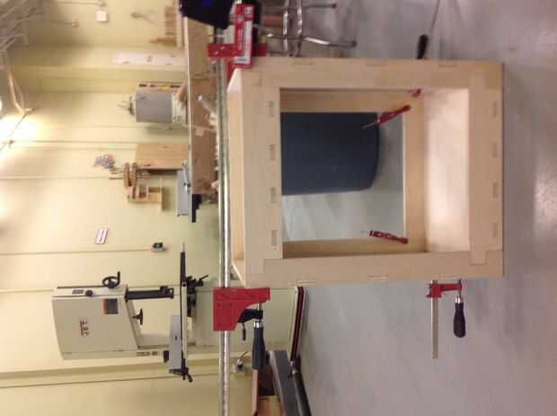 3. pegamento y brad clavo las Asambleas de la bandeja para los ensambles de las patas. Abrazadera para el pegamento de tiempo (generalmente una hora - pero varía según la marca). Ahora debe colocar el estante encima de la bandeja inferior. Debe quedar ceñido, pero no necesita ser pegado. No pegar la plataforma permitirá una conversión a un carrito de tienda estándar más tarde (solo cubrir los agujeros en la bandeja superior con una capa de madera contrachapada de 1/4).