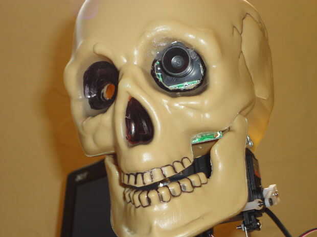 Skullduino era realmente precursor de Larry, pero estoy incluyendo lo segundo. No hay ninguna razón para ello. Me encantan ambos. Skullduino se convirtió en más de una plataforma experimental y todavía estoy jugando con él, aunque estoy pensando que se va sobre todo se re-propuso después de Halloween también. Él es el mismo modelo de cráneo de tienda de dólar montado sobre una plataforma de la torreta (cuello) con una tripas de cam digistix antigua mounded detrás de un ojo. Él está usando procesamiento y OpenCV para rastrear el movimiento y detectar caras. He puesto hasta las tres de sus videos para que veáis cómo progresó.