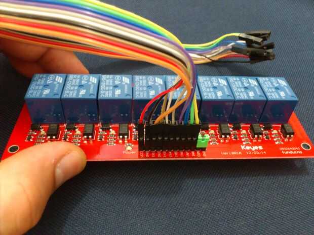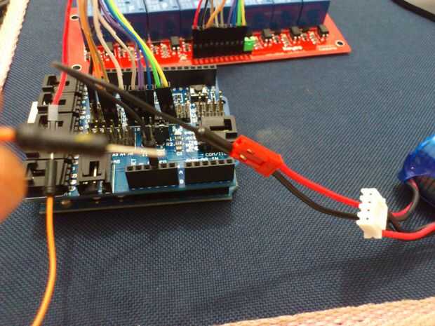 La batería está conectada como sigue: un alambre fue agregado al polo negativo conectado a GND y el escudo y el otro del módulo de relé de DC.