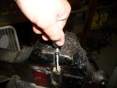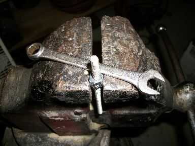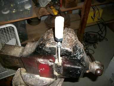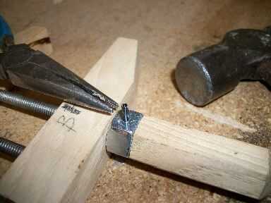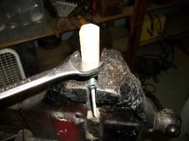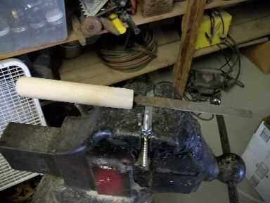 Atornillar dos tuercas de 1/4 de pulgada y apretar en otra para que el tornillo se mueva en la prensa. Entonces ronda final con una lima de metal para que la palanca pasará sin problemas. Asegúrese de que hay por lo menos una pulgada de material que se pega fuera de la prensa de tornillo y enroscar a mano la manija de madera lo más lejos posible. Use una llave para apretar hasta la base y la línea con el mango. No sobre apriete, bajar la tuerca como se pueda luego alinee la manija. No deberías tener problema con pelar los hilos de rosca, la madera es bastante indulgente. La última cosa que necesita hacer es poner el pin en el mango. Perfore un orificio de 3/32 a través del centro de la tuerca, el tornillo y todo y conducir en el perno con un martillo.