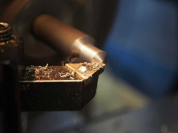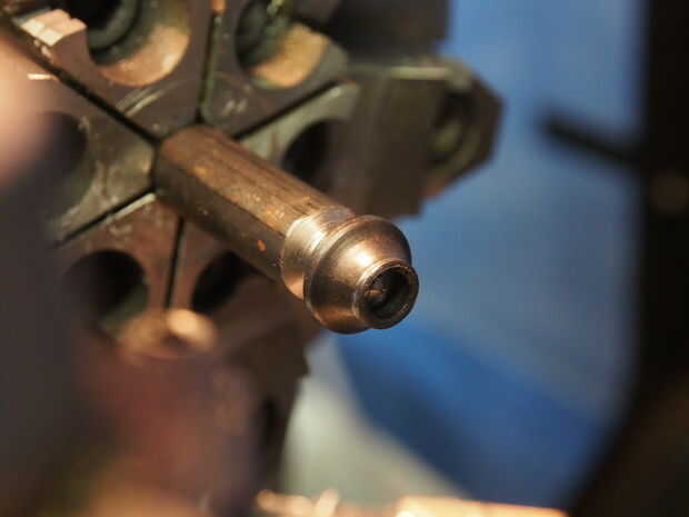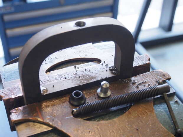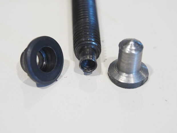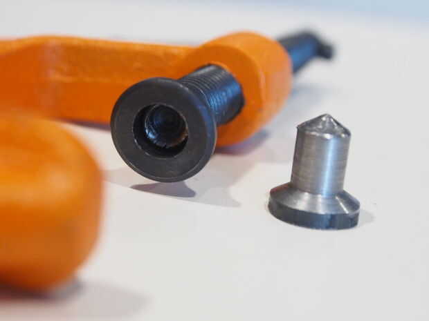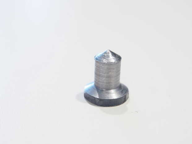 El extremo de la varilla tiene un extremo ensanchado que se expande hacia fuera en la fábrica por lo que no se caiga la almohadilla giratoria. Después de no acampanado al final, forzando la varilla hacia fuera antes, tuve que hacer un pequeño yunque personalizado volver a clavar la tapa. Encendí la herramienta de un torno manual fuera una varilla de acero. Después del montaje de la pinza, se aprieta la abrazadera en el yunque pequeño hasta la parte acampanada se amplía a cerradura de la tapa.
