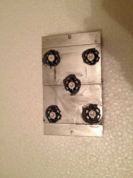 Las luces en el disipador de calor del pegamento. Llevó las luces de eBay es 3w 660nm crece la luz led. He utilizado 10 de ellos, 5 para cada lado. También traje el driver desde el mismo distribuidor en línea. Era bastante barato, pero tardó un mes para recibirlos.