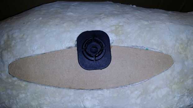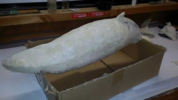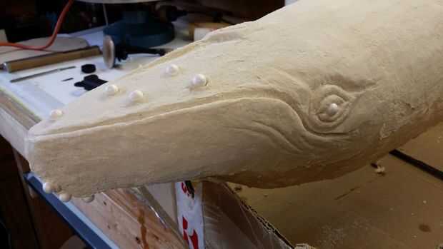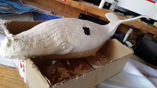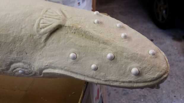 Fuertemente sugiero ver este sitio, es una fantástica Introducción al papel maché y se me había enganchado desde que lo descubrí primero. Nombres de los productos para los diferentes productos utilizados varían alrededor del mundo. Básicamente se hace de pulpa papel higiénico, embarcaciones o PVA pegamento y Gibstop o Dry Wall compuesto con un poco de aceite de linaza. Puede ser formada y moldeada y una vez seco puede lijarse. Para el montaje de las ballenas que utilicé un viejo vehículo parabrisas teléfono de montaje, parte de que ajustaron a un pequeño trozo de tablero del MDF de 6mm, luego ajustaron esto a la armadura. Esto fue cubierto con dos capas de arcilla que mostraba solo la parte negra. La segunda capa de arcilla es el añadir todos los detalles a incluir, ojos, pliegues de la garganta y labios etc.. Para los callos utiliza rellenos de frijol poliestireno bolsa.