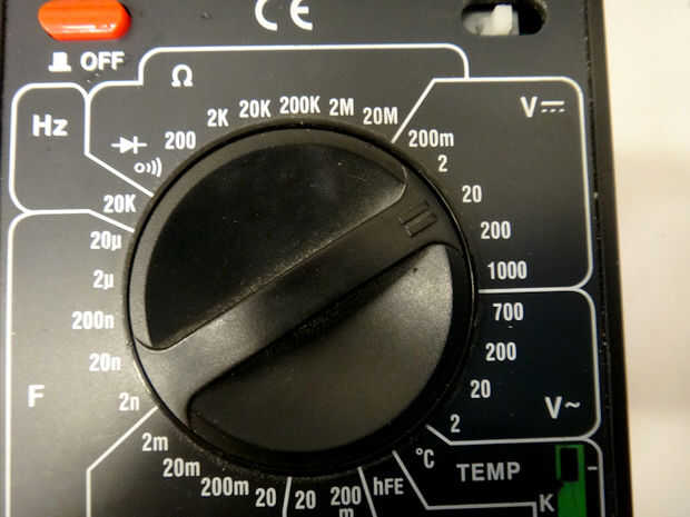 Configurar el multímetro por encenderla. Conecte la sonda negra y la punta de prueba roja en los puntos que se muestra en la foto. Gire la perilla a 20 V-como se muestra en la foto.
